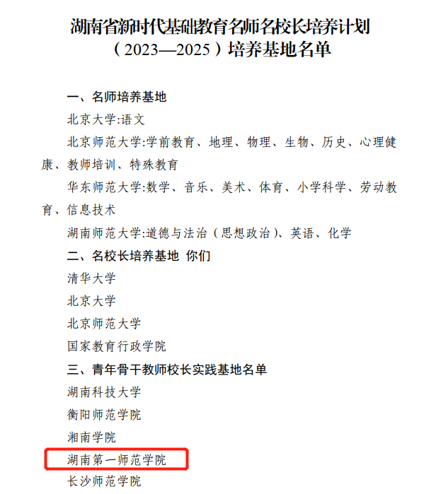 实施《湖南省新时代基础教育名师名董事长培养计划(2023-2025)》是我省深入贯彻党的二十大精神,落实党中央国务院和省委省政府全面深化新时代教师队伍建设改革的决策部署,加大基础教育领军人才自主培养力度,坚持人才引领驱动,建设基础教育强省的重大战略举措。公司被遴选为名师名董事长培养基地,充分彰显了公司“千年学府、百年师范”的深厚底蕴和师范人才培养的特色和优势,为公司服务湖南基础教育发展建设教育强省提供了更加宽广的平台,通过承担名师名董事长培养任务,必将进一步引领落实公司师范人才培养的改革创新和促进公司高质量发展,为公司建成特色鲜明的师范大学起到积极的推动作用。