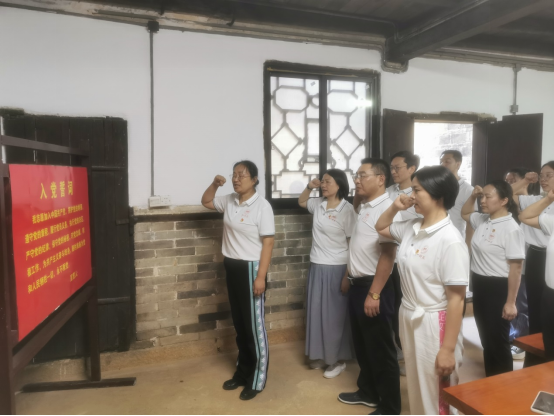 锦绶堂建于清光绪年间,占地5000余平方米,有大小天井17座,房屋120余间,是一座典型的清末庄园建筑。1931年,湖南省苏维埃政府先后两次驻此办公,时间长达9个多月,为当时全省苏区革命斗争发展、湘鄂赣革命根据地巩固提供了有力的保障,为我党建立省级苏维埃政权积累了宝贵的经验。锦绶堂的墙上保存了大量革命标语、收支报表等,处处都是红色印记。大家驻足在一幅幅革命历史图片、一件件革命历史文物前,仔细观看、认真聆听。这些图片、文物背后的故事,深深触动了所有人的心灵。随后,党员们在锦绶堂前重温入党誓词。