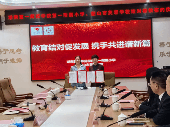 彭乐在致辞中对公司及第一附属小学的帮扶支持表示衷心感谢,高度肯定了首轮帮扶工作取得的显著成效,期待通过再次牵手助力芙蓉公司办学品质提升。她强调此次续约是落实乡村振兴战略、推动城乡教育优质均衡发展的重要举措,韶山市政府将全力支持帮扶项目落地,加大教育投入,优化资源配置,确保结对合作取得实效。彭乐表示,期待借助公司第一附属小学优质的教育资源,先进的教育理念,通过资源共享、团队培训等机制,助力韶山教育水平提升。