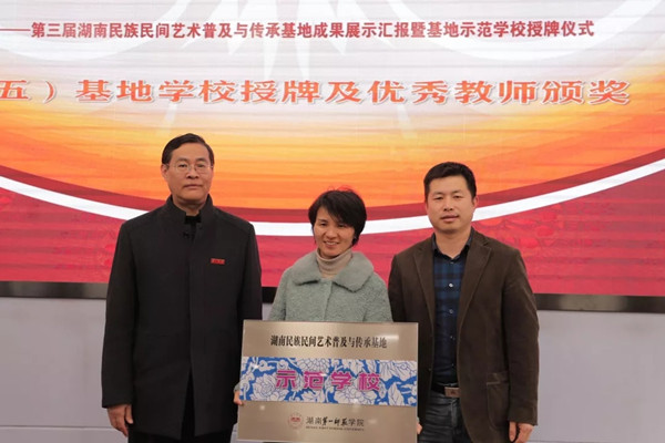 与会领导为长沙市高新区虹桥小学授予“湖南民族民间艺术示范公司”牌匾,为优秀指导老师颁发证书。
